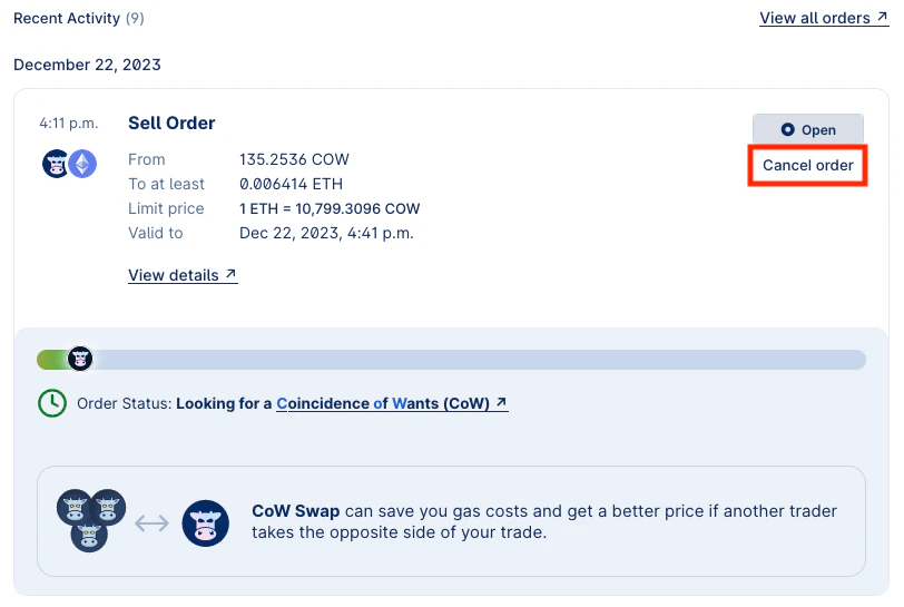 Changed your mind? Not a problem! CoW Swap makes it easy and gasless1 to cancel your order. First, open the activity panel by clicking on your address in the top right corner.