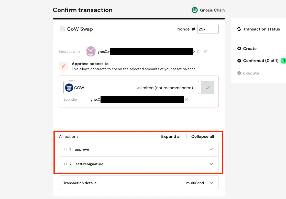 When you’re ready to swap, click the “Swap” button. You will be prompted to confirm the swap. This is when you can review the details of the swap (i.e. the quote, the slippage tolerance, etc.). If you’re happy with the details, click “Confirm Swap”. You will be prompted to sign the order. Be careful when signing an order. All of the associated parameters are final and cannot be changed once the order is signed and submitted to the API. If you make a mistake, you will need to cancel the order and create a new one.