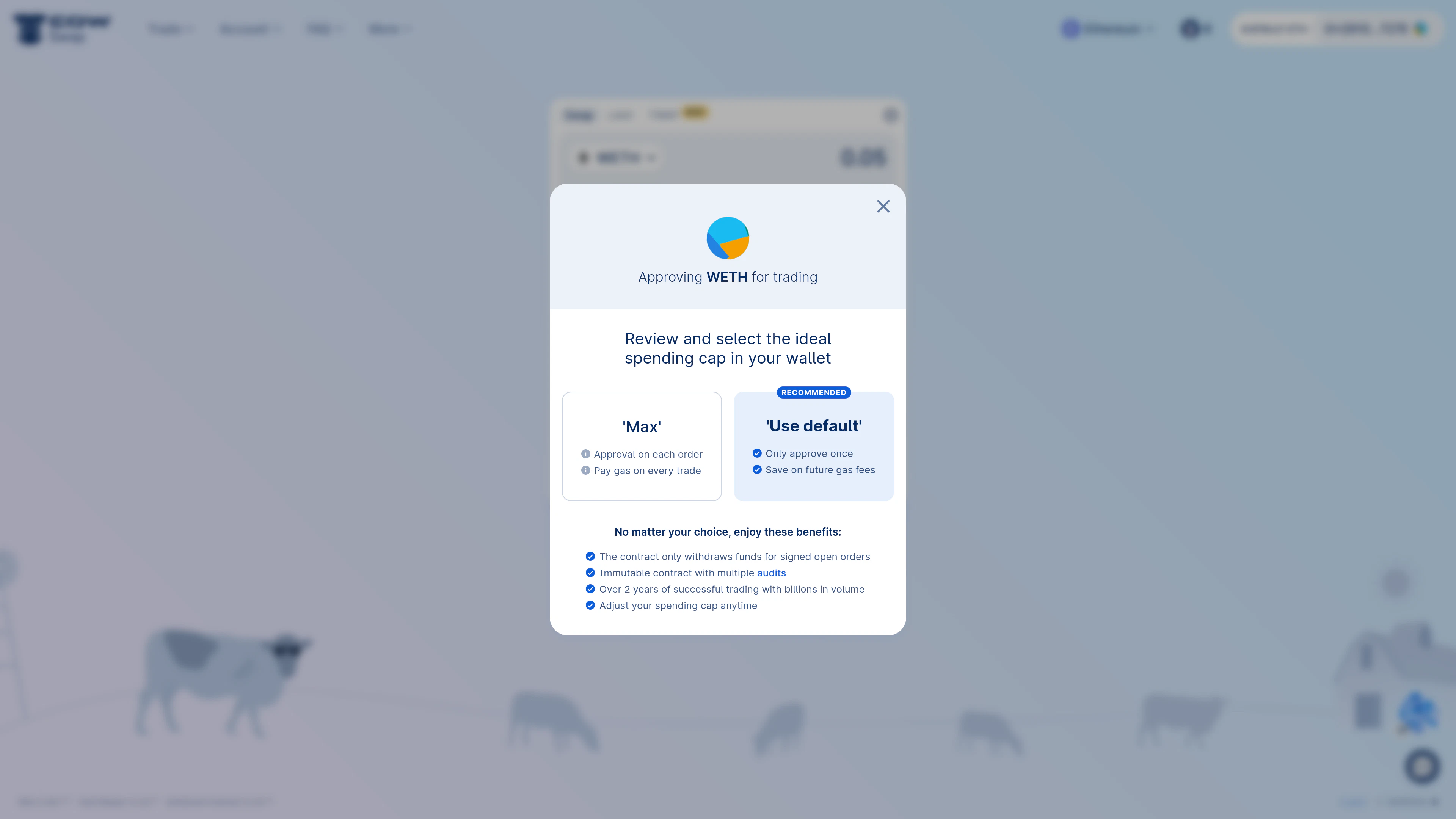 USDC, DAI, COW and many others support gasless approvals. This means that you can approve the vault relayer contract to spend your tokens without having any initial gas for an on-chain transaction. This is a great way to save on gas costs!You don’t have to worry about this, as CoW Swap will automatically detect if the token supports gasless approvals and will guide you through the process.Just look for the gasless approval flag when picking the tokens to get started: